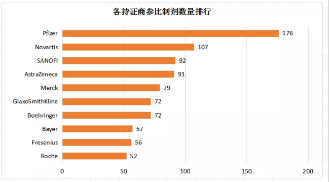 目前拥有参比制剂数量最多的是辉瑞(Pfizer),其次是诺华(Novartis),赛诺菲(SANOFI)排名第三。排名前三的企业均是全球新药研发的龙头企业,这也和参比制剂遴选原则比较吻合。