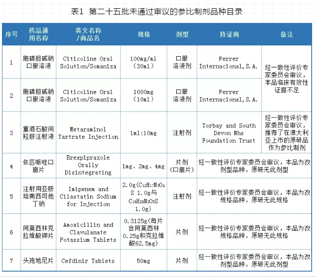 第二十五批、二十六批首次公示的未通过审议的参比制剂共计29个品规。